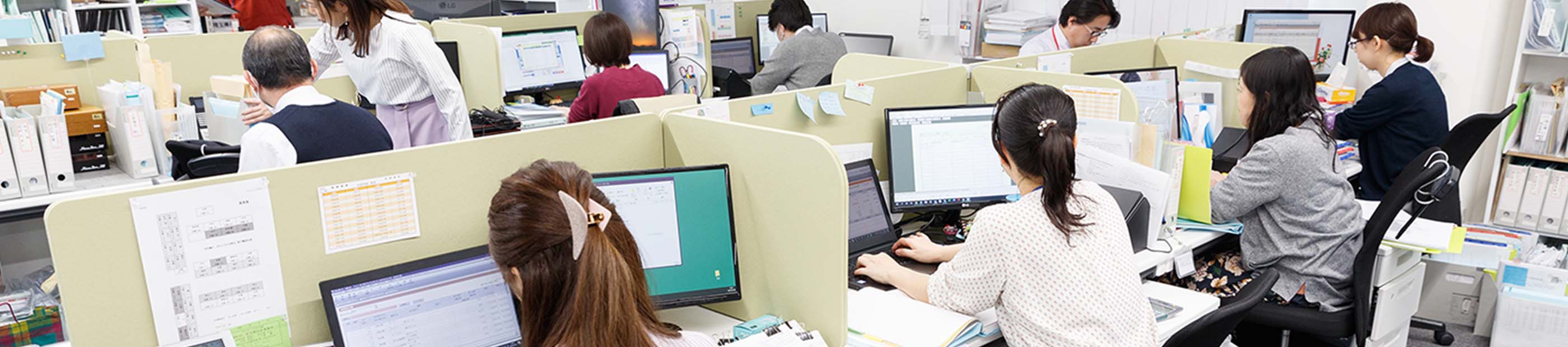 スタッフは、チーム制で働いています。所内は⾵通しが良く、相談しやすい環境になっています。スタッフ同⼠は当然のこと、お客様に対してもコミュニケーションを⼤事に考えており、いただいたご相談に寄り添うことを⼤切にしています。